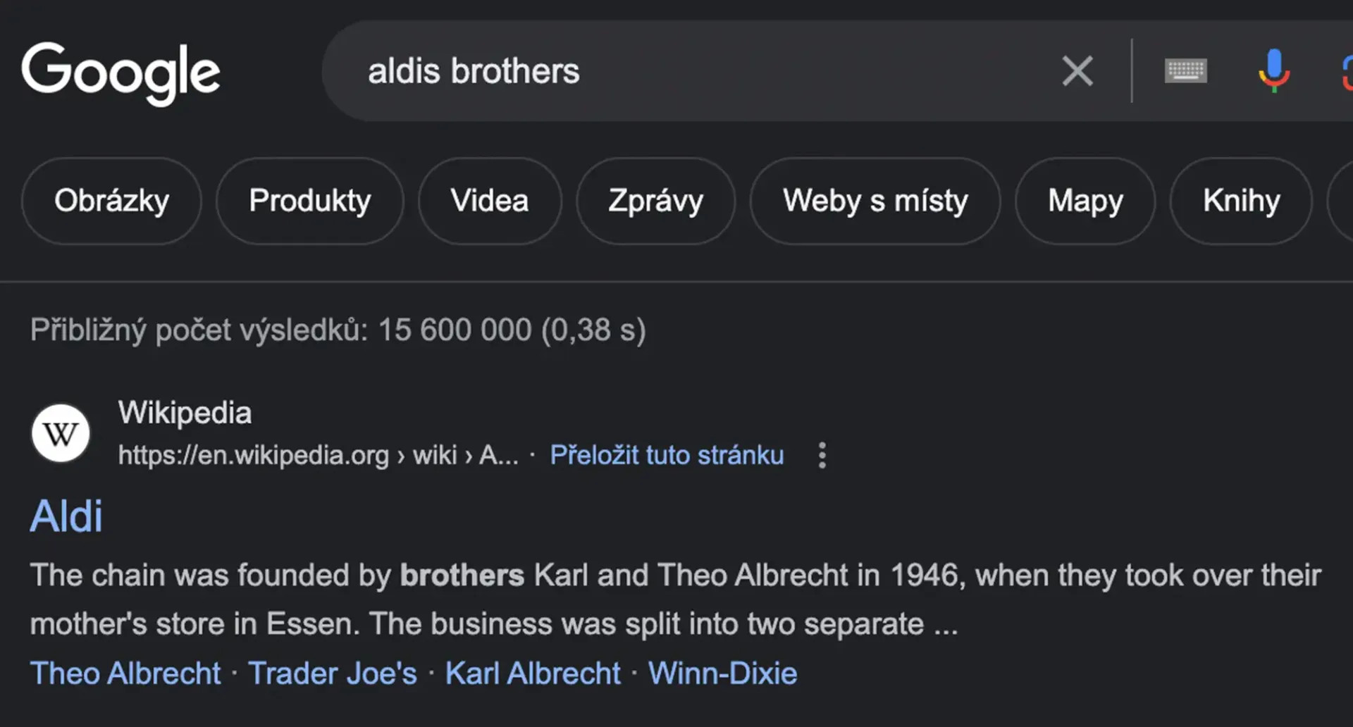 - Vševidoucí řádek Googlu však na dotaz Aldis Brothers sveřepě deklamuje příběh bratrů založivších obchodní řetězec Aldi. :(